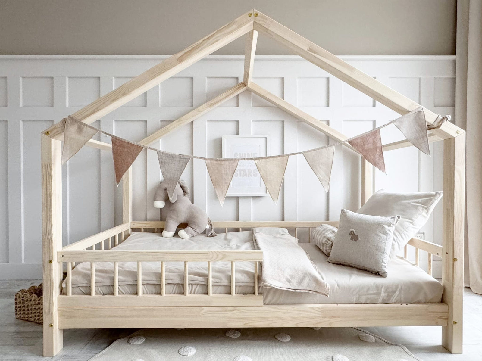BELLO hussengen er en stilfuld og fleksibel løsning til børneværelset, der kombinerer funktionalitet, sikkerhed og et minimalistisk skandinavisk design. Sengen er designet med aftagelige sengeheste, hvilket giver mulighed for at tilpasse den efter barnets behov – fra tryg begyndelse til større bevægelsesfrihed, når barnet bliver ældre. Dette gør BELLO hussengen til en langtidsholdbar og praktisk investering, der vokser med dit barn.