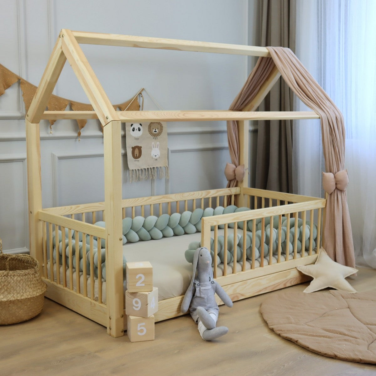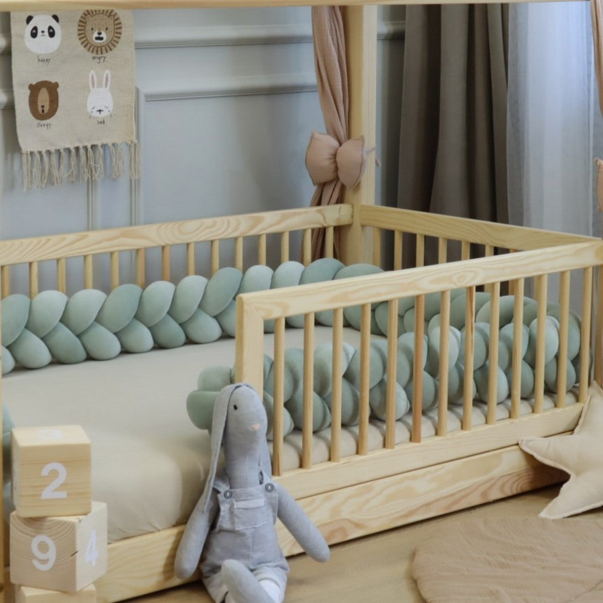 - Sikkerhed og beskyttelse: Den tykke, polstrede fletning beskytter barnet mod at ramme sengens hårde kanter, hvilket skaber et sikkert miljø for både leg og søvn.