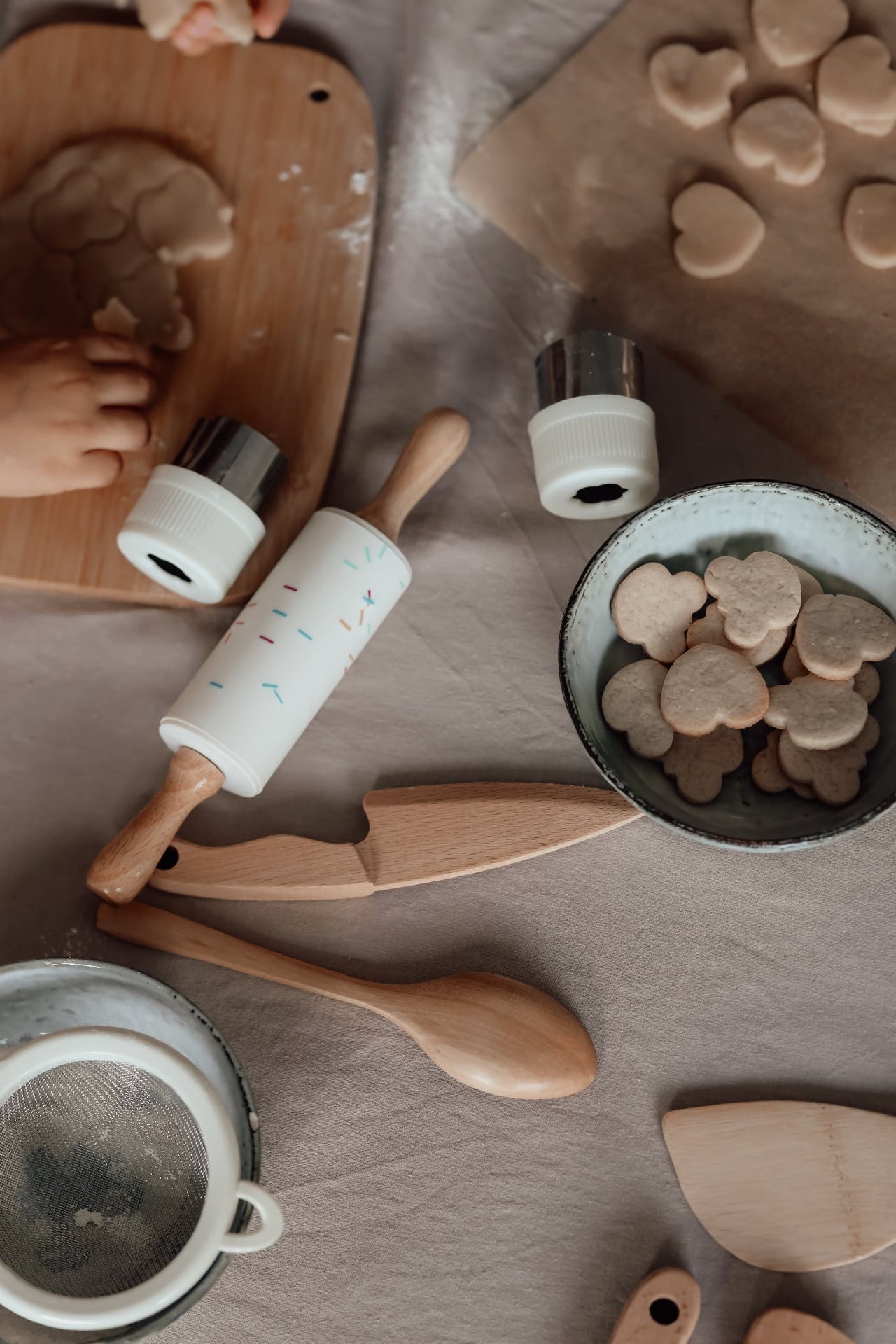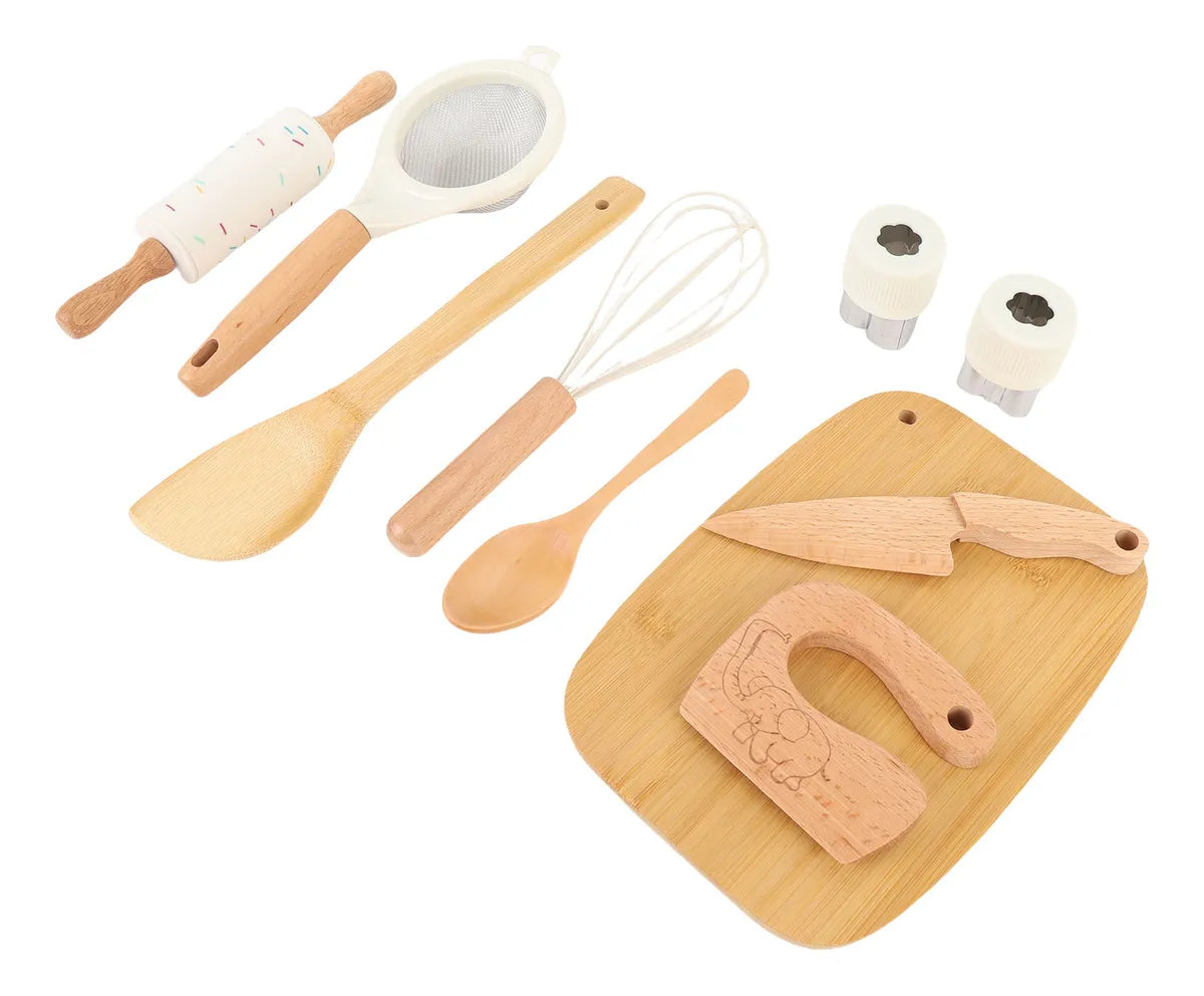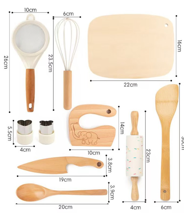 Barnvänligt köksset i trä - 10 delar med kniv och bestick. Perfekt för små kockar! Säkert, lärorikt och perfekt för matlagning med barn.
