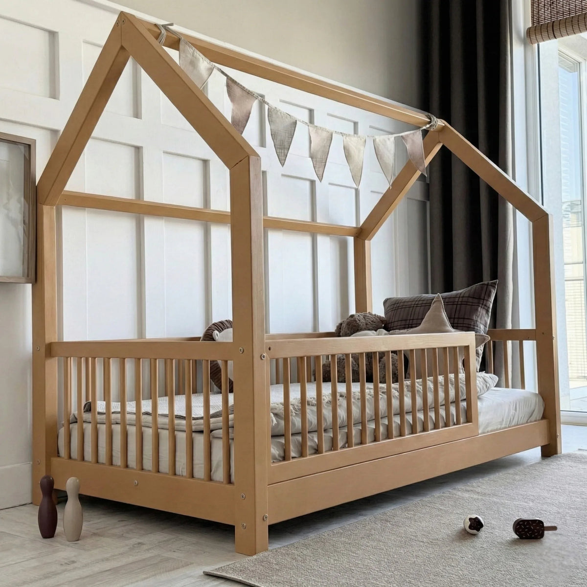 BIANCO hussäng är designad i skandinavisk stil och tillverkad av slitstarkt furuträ. Den är noggrant slipad för säkerhet, vilket gör den idealisk för barn. Ribborna, som fungerar som sänggrindar, är avtagbara och kan monteras på både vänster och höger sida. Sängramen består av ribbor. Sängen levereras i obehandlat trä med en leveranstid på cirka 14 dagar; madrass ingår ej. Om du vill ha sängen i andra mått kan detta ordnas vid beställning. Kontakta oss på info@hemmingsenkids.dk för mer information.