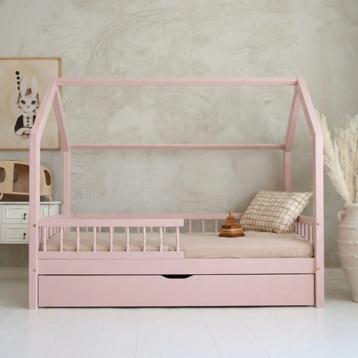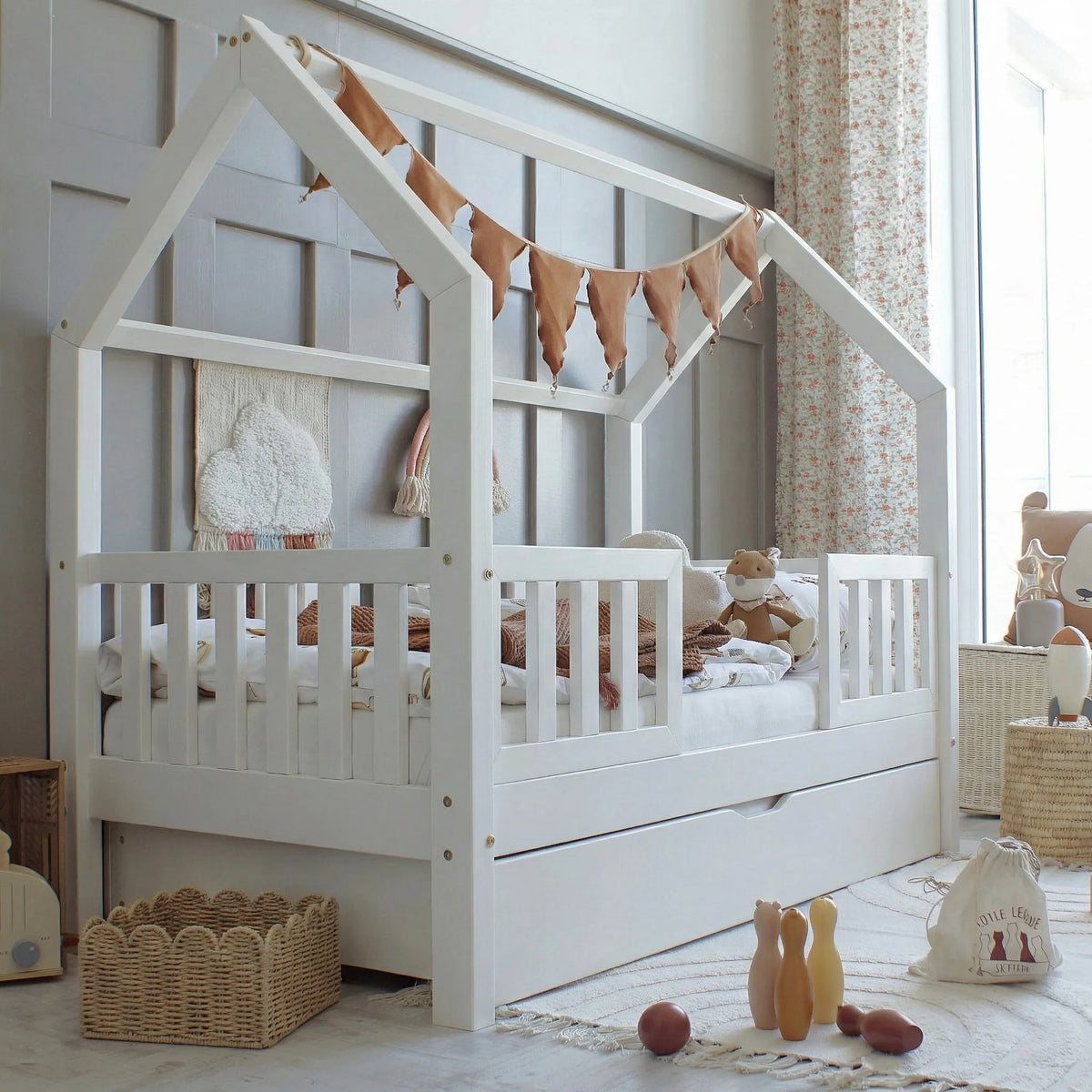 Med sin skandinaviska design som betonar enkelhet och funktionalitet integreras denna hussäng sömlöst i alla moderna barnrum. Tillverkad av robust och noggrant slipad furu, säkerställer Bianco inte bara estetisk tilltalande utan också den nödvändiga säkerheten, vilket är oumbärlig i ett rum där barn leker och sover.
